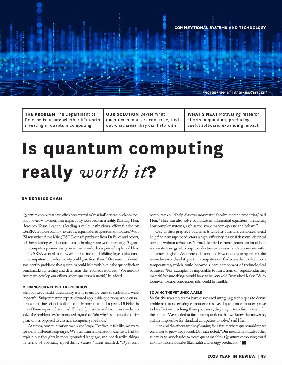 Article about USC ISI research teams devising tests for quantum computers to inform the US Department of Defense's investment into these technologies.