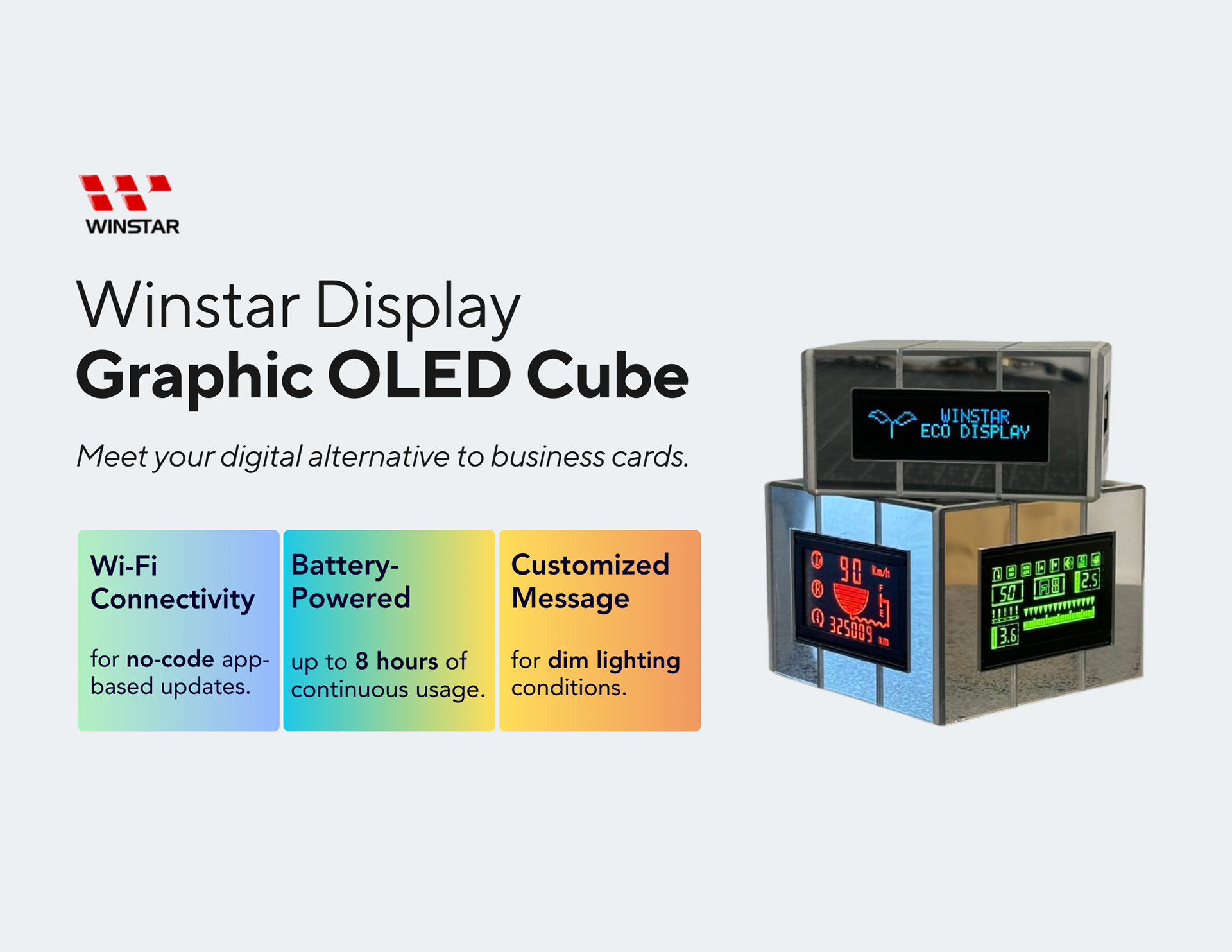 Poster for Winstar Display USA's graphic OLED cube and GUI builder, prepared for the Anaheim Electronics & Manufacturing Show 2024.